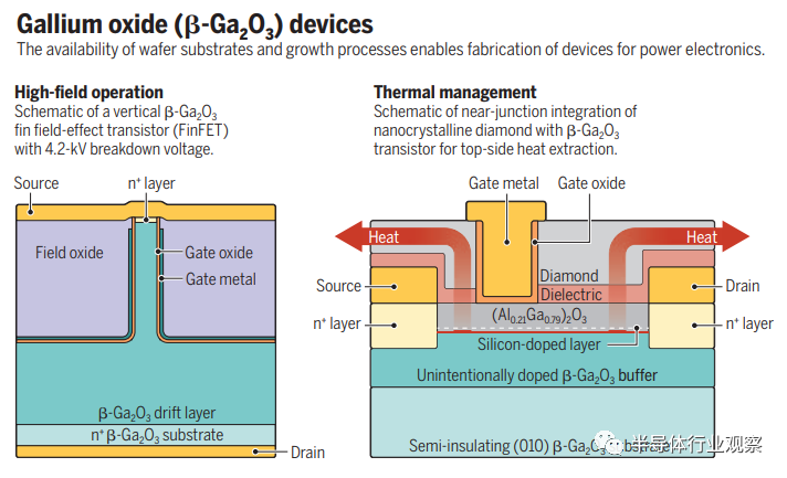 必須仔細(xì)考慮Ga2O3極低的導(dǎo)熱系數(shù)(11到27 W m-1K-1)。Ga2O3晶體管的冷卻甚至比GaN晶體管更關(guān)鍵,后者也有自熱效應(yīng)。盡管Ga2O3器件在運(yùn)行過(guò)程中輸出的功率與GaN器件相比仍然要低一個(gè)數(shù)量級(jí),但為GaN開(kāi)發(fā)的頂部和底部側(cè)冷卻方法可以應(yīng)用于Ga2O3。事實(shí)上,用AlN或納米晶金剛石覆蓋橫向晶體管可以實(shí)現(xiàn)Ga2O3 5-6w mm-1的直流輸出功率,這與20世紀(jì)90年代GaN高電子遷移率晶體管的早期結(jié)果類似。具有高導(dǎo)熱性的異質(zhì)集成WBG p型半導(dǎo)體,如SiC, GaN,甚至金剛石,尤其適用于p-n和結(jié)勢(shì)壘肖特基整流器。
